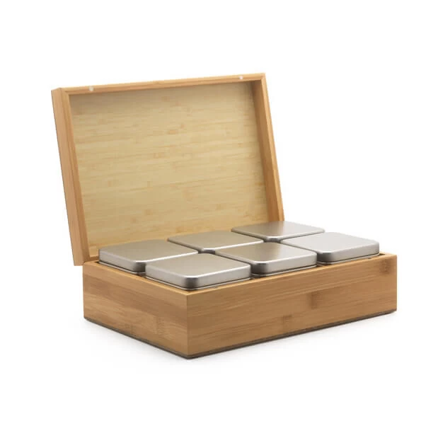 Met de theedoos van Bredemeijer serveert u uw losse thee op een nette en geordende wijze. De houten kist is voorzien van zes kleine blikjes met deksel. Hierdoor blijft uw losse thee langer goed en is deze gemakkelijk te ordenen.