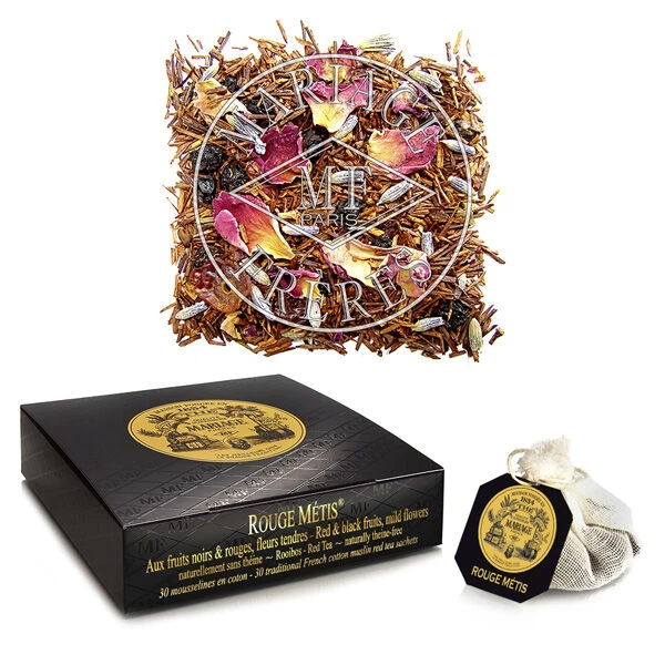 Mariage Frères thee komt in een zwart doosje met 30 zakjes thee. Deze rooibosthee is een kruising van rode rooibos met fruit, citrusvruchten, kruiden en bloemen.