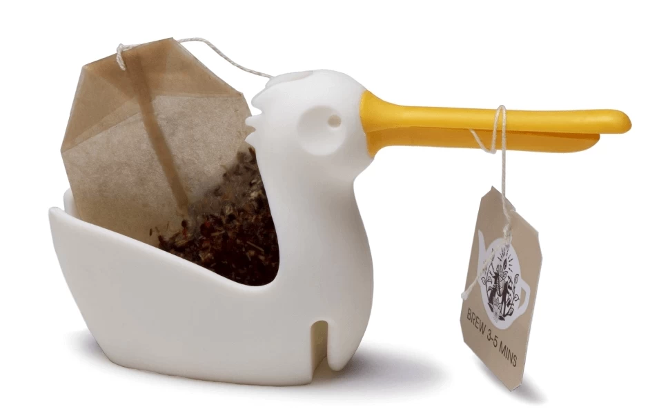 De Peleg Pelicup is gemaakt van wit en geel kunststof. De Pelicup is vormgegeven als pelikaan en kan theezakjes vasthouden met zijn lange snavel, daarnaast kan de Pelicup met de uitsparing op uw glas rusten.
